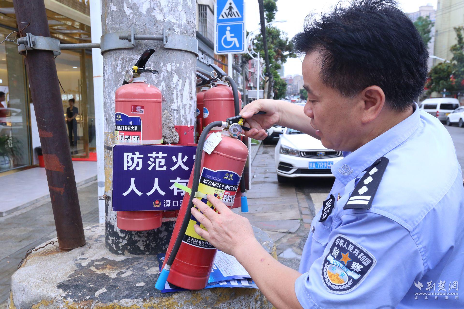 民警賀廣武正在介紹電線桿旁放置的滅火器。通訊員供圖