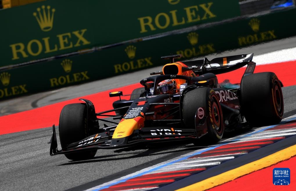 6月28日,紅牛車隊荷蘭車手維斯塔潘駕駛賽車在練習賽中。新華社記者 賀燦鈴 攝