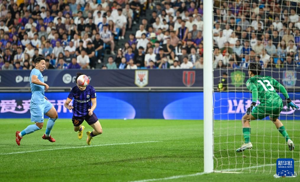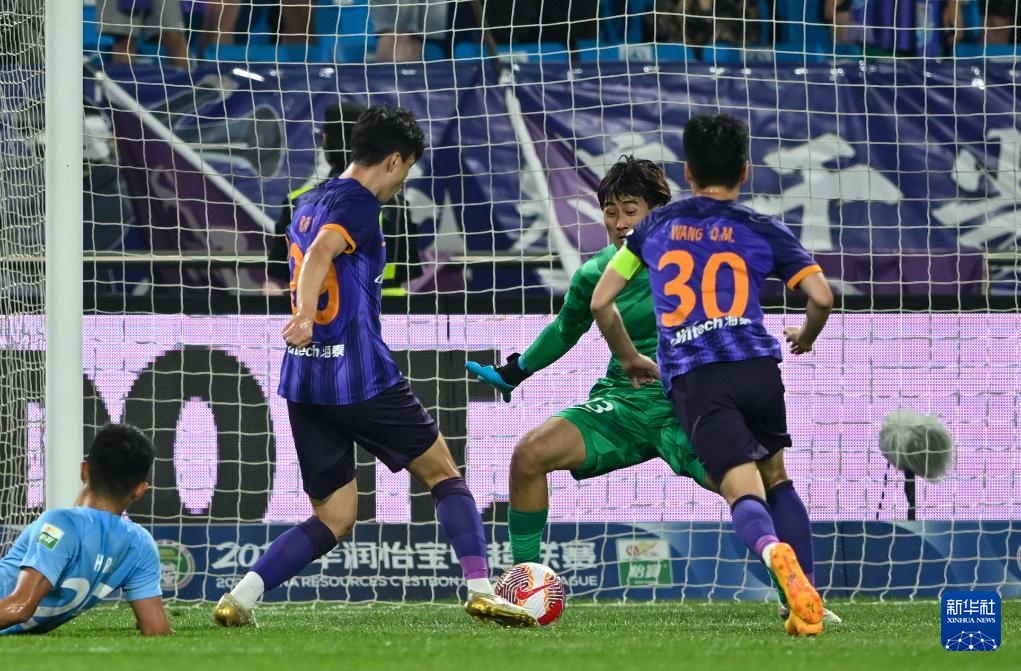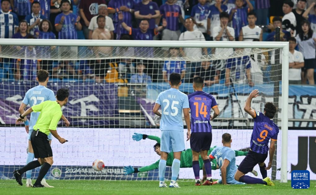 6月29日,天津津門虎隊球員孔帕尼奧(右一)在比賽中射門得分。新華社記者 孫凡越 攝