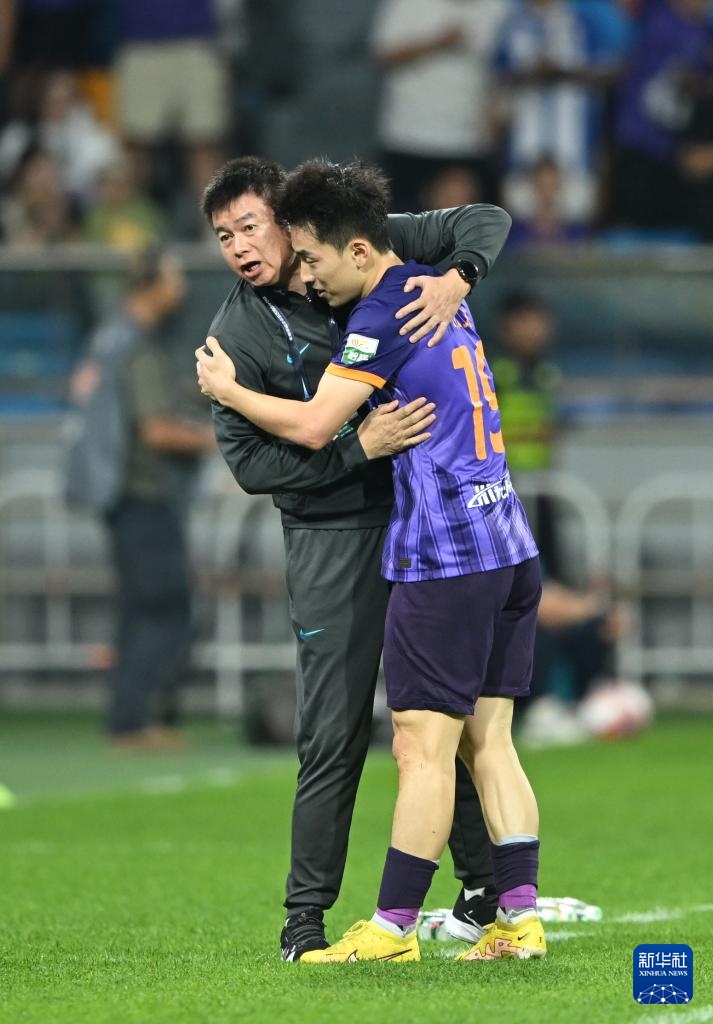 6月29日,天津津門虎隊球員劉俊賢(右)在進球后與主教練于根偉擁抱慶祝。新華社記者 孫凡越 攝