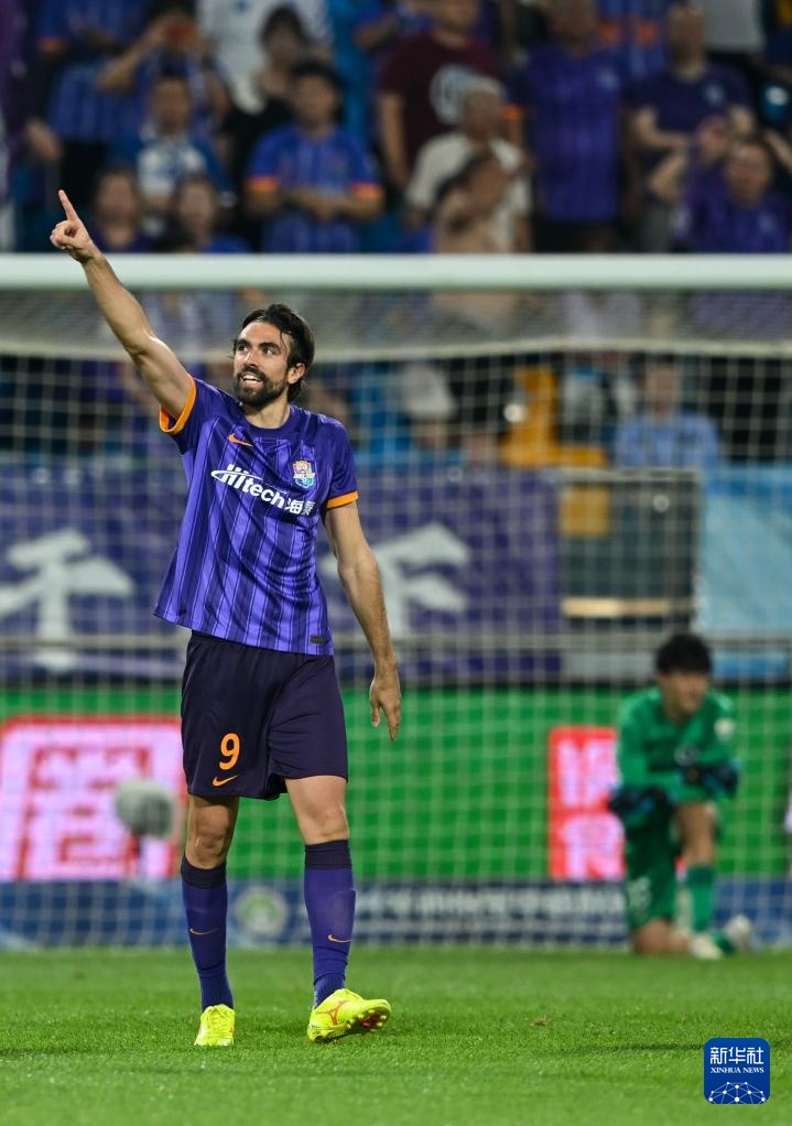 6月29日,天津津門虎隊球員孔帕尼奧在比賽中進球后慶祝。新華社記者 孫凡越 攝