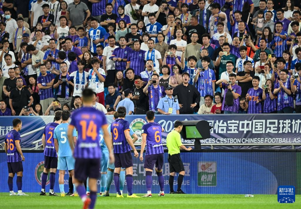 6月29日,本場比賽主裁判孟祥昆(下右一)在比賽中查看VAR(視頻助理裁判),隨后向深圳新鵬城隊球員蒂亞戈出示紅牌。新華社記者 孫凡越 攝