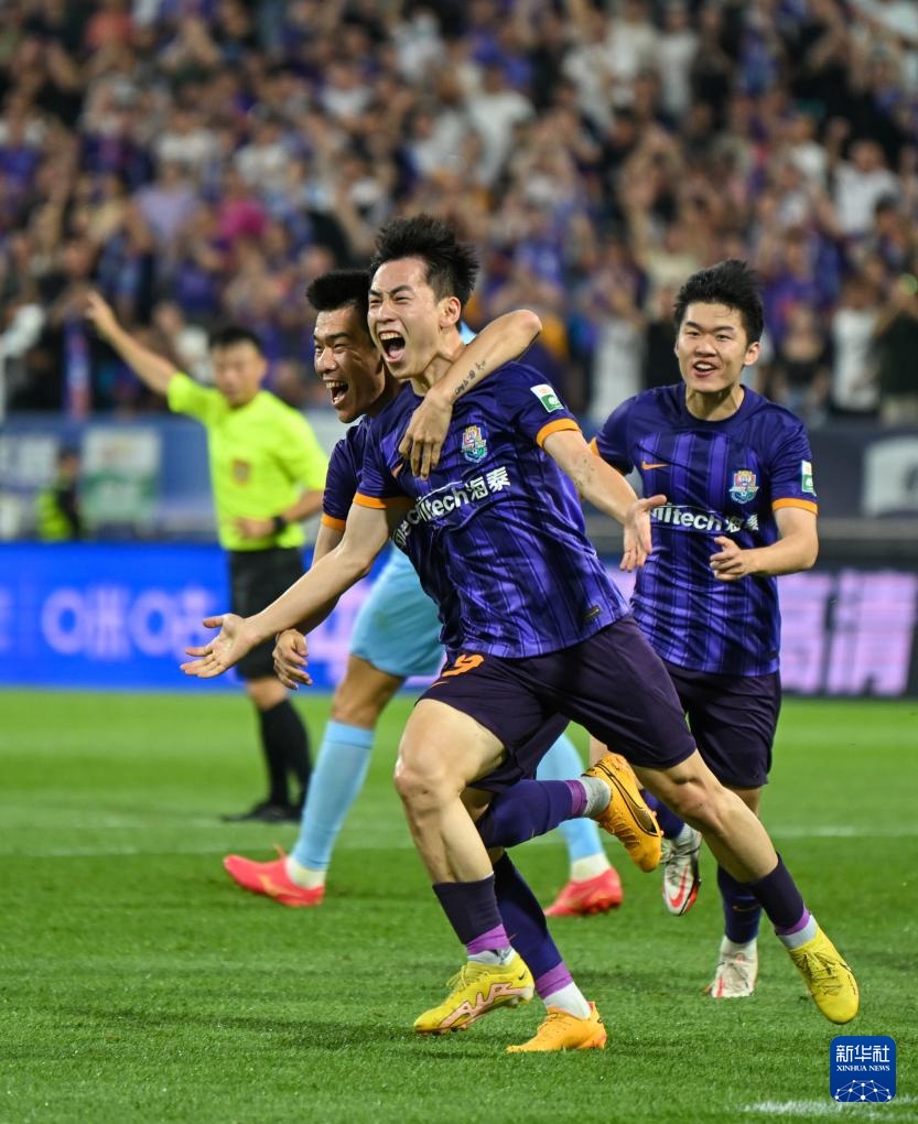 6月29日,天津津門虎隊球員劉俊賢(左一)在比賽中進球后慶祝。新華社記者 孫凡越 攝