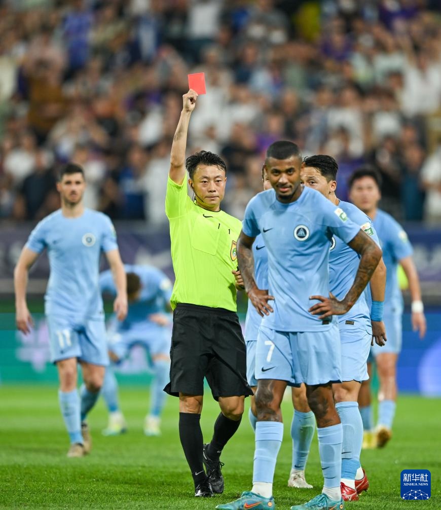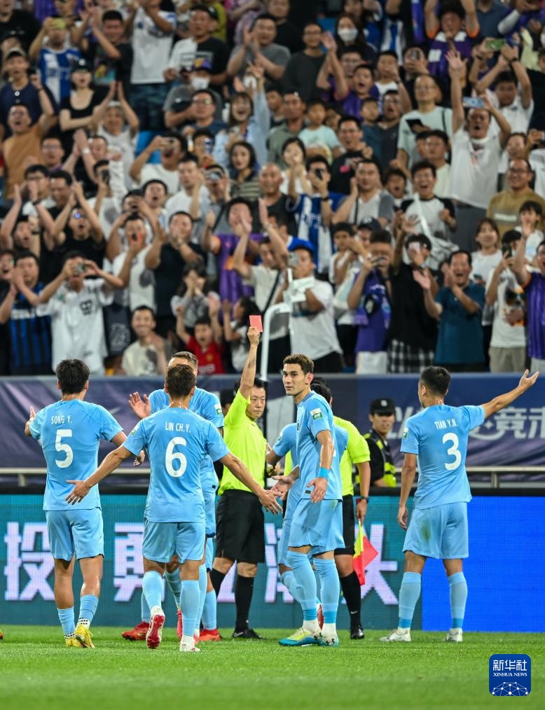 6月29日,本場比賽主裁判孟祥昆(中)在查看VAR(視頻助理裁判)后向深圳新鵬城隊球員田依濃(右一)出示紅牌。新華社記者 孫凡越 攝