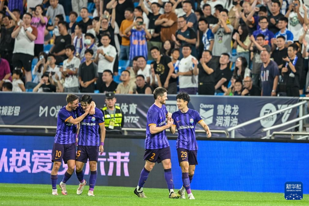 6月29日,天津津門虎隊球員巴頓(右一)在進球后與隊友慶祝。新華社記者 孫凡越 攝