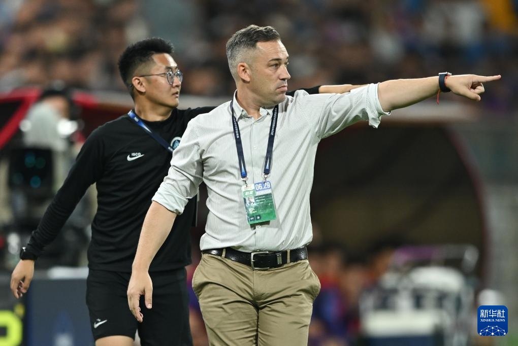 6月29日,深圳新鵬城隊主教練赫蘇斯·塔托(右)在場邊指揮。新華社記者 孫凡越 攝