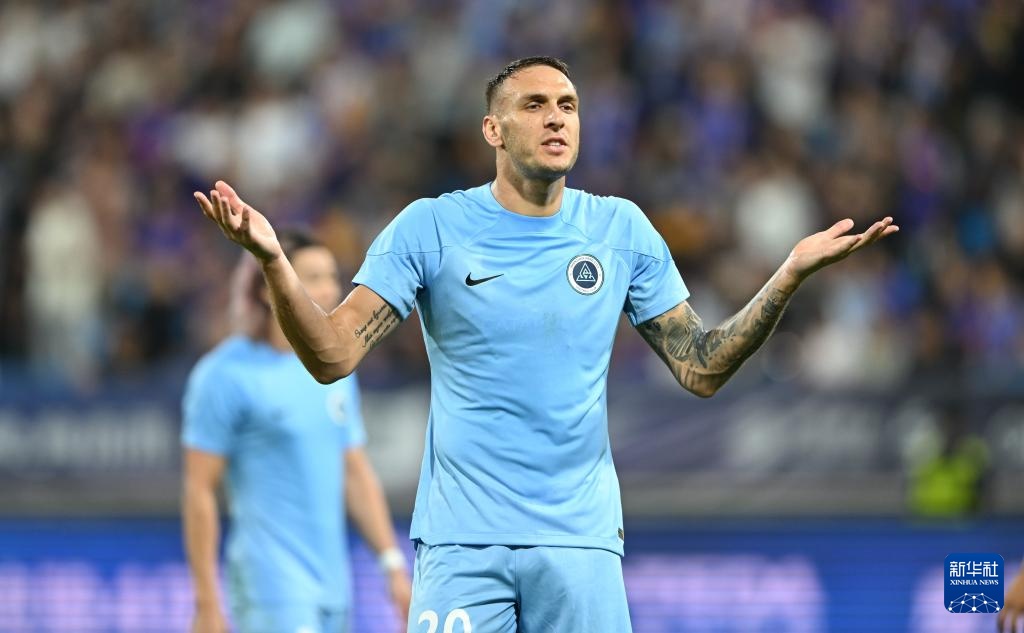 6月29日,深圳新鵬城隊球員杜加利奇在本隊第二人被出示紅牌后神情無奈。新華社記者 孫凡越 攝