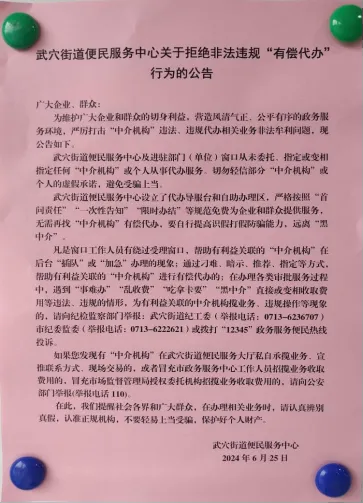 荊楚網(湖北日報網)訊(通訊員 查捷頻)為打造公開透明、高效便捷的服務環境,維護辦事群眾合法權益,進一步營造精準高效、優質便民、風清氣正的營商環境,近期,武穴市武穴街道便民服務中心針對辦事群眾反映收到短信、電話告知可有償幫代辦個體戶注冊注銷等業務問題開展專項整治活動,嚴厲打擊損害政府形象的“黑中介”等問題,堅決保障辦事群眾切身利益。