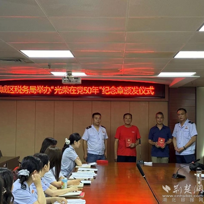荊楚網(湖北日報網)訊(通訊員 陳淳)為慶祝中國共產黨成立103周年,7月1日,鄂城區稅務局舉行“光榮在黨50年”紀念章頒發儀式。一枚光榮紀念章,承載責任與激勵。區局黨委書記金暉為“光榮在黨50年”黨員依次頒發紀念章。