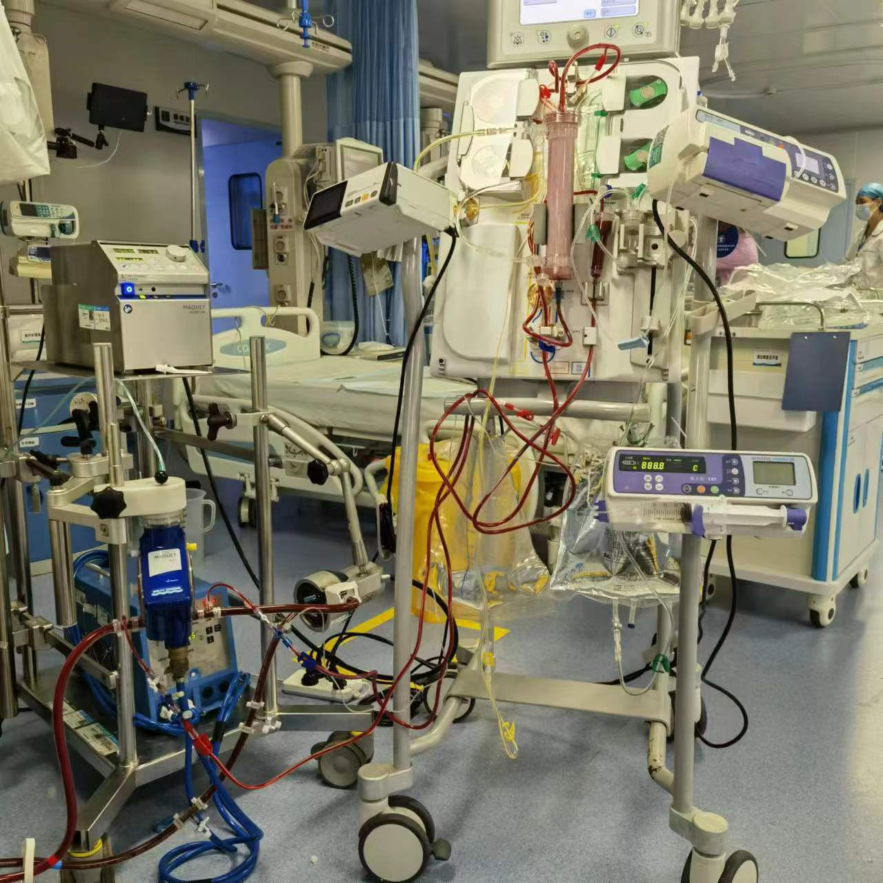 該院重癥醫(yī)學科副主任徐夢經(jīng)過充分評估并與上級醫(yī)院教授商議后認為,目前狀況只能進行ECMO治療支持,當即請示醫(yī)院業(yè)務領(lǐng)導,得到批準后,開始洪湖市首例ECMO術(shù)前準備。徐夢團隊于6月30日上午11:00為患者置管成功,在重癥醫(yī)學科病區(qū)內(nèi)給予V-A ECMO(一種提供心臟和呼吸支持的治療方法)上機,治療中存在嚴重內(nèi)環(huán)境紊亂。經(jīng)ECMO+CRRT上機后,患者生命體征逐漸穩(wěn)定,血壓回升,內(nèi)環(huán)境較前好轉(zhuǎn),生命體征暫時穩(wěn)定,為后續(xù)的治療創(chuàng)造了條件。