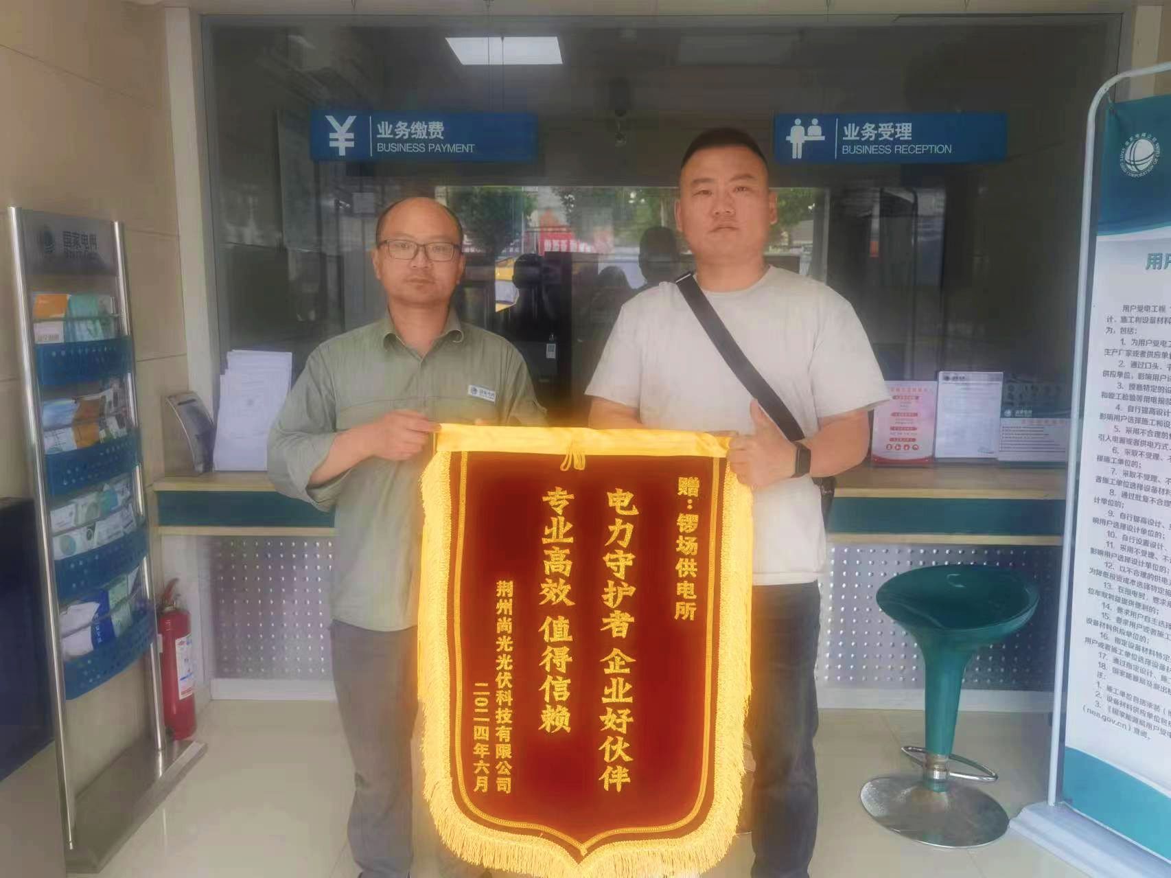 荊楚網(wǎng)(湖北日?qǐng)?bào)網(wǎng))訊(通訊員 陳春梅)7月1日,荊州尚光光伏科技有限公司負(fù)責(zé)人來到國(guó)網(wǎng)荊州供電公司城區(qū)供電中心鑼場(chǎng)供電所營(yíng)業(yè)廳,送上了一面印有“電力守護(hù)者 企業(yè)好伙伴 專業(yè)高效 值得依賴”的錦旗,對(duì)該供電所提供優(yōu)質(zhì)高效的服務(wù)表示贊揚(yáng)和感謝。