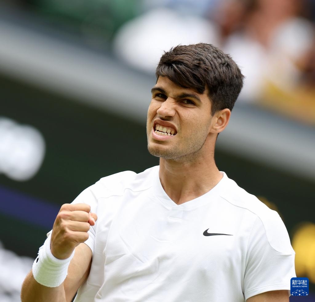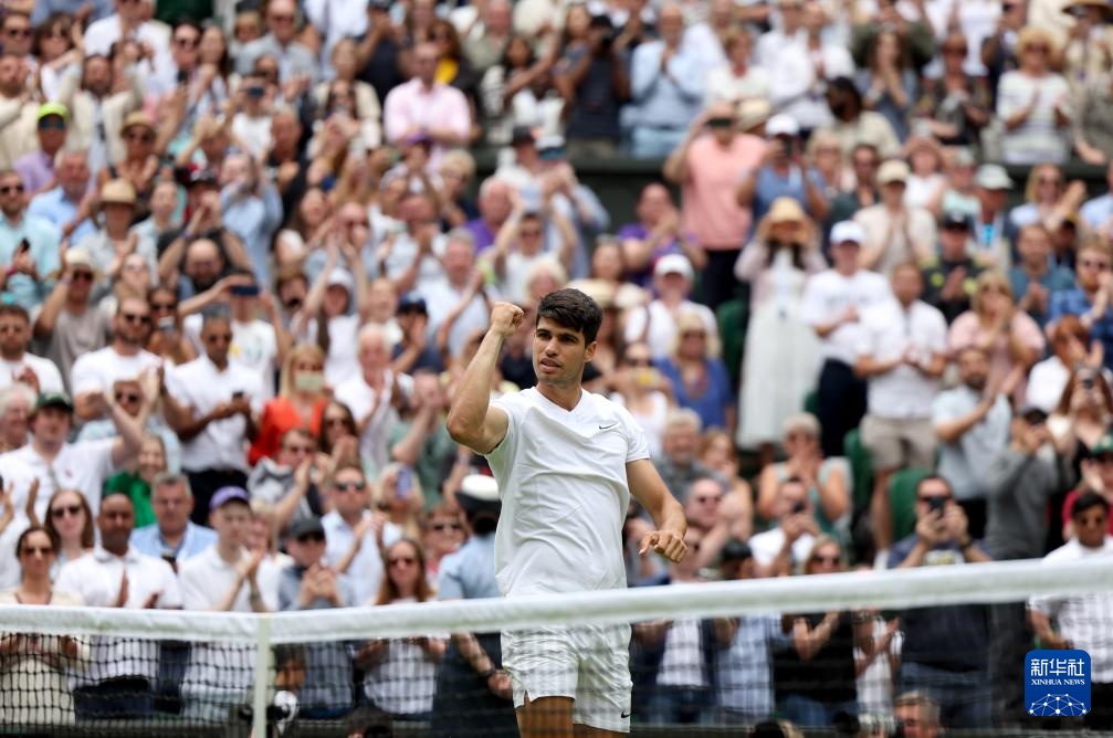 7月1日,阿爾卡拉斯在比賽后慶祝勝利。新華社記者 李穎 攝
