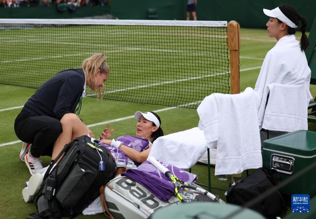 7月3日,鄭賽賽(下)在第一盤結束后接受治療。新華社記者 韓巖 攝