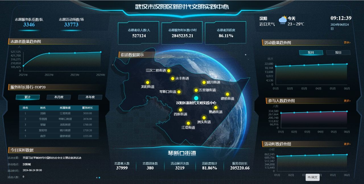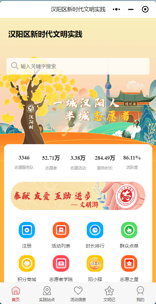 2021年,為推進(jìn)“志愿服務(wù)之城”提質(zhì),漢陽(yáng)區(qū)開發(fā)了“漢陽(yáng)區(qū)新時(shí)代文明實(shí)踐”小程序1.0,居民動(dòng)動(dòng)手指,即可在“指尖”參與文明實(shí)踐與志愿服務(wù)。2023年,上線了集志愿服務(wù)隊(duì)伍、志愿者數(shù)據(jù)等5大維度與活動(dòng)列表、群眾點(diǎn)單、積分商城等8大模塊50余種功能于一體的文明實(shí)踐信息平臺(tái)2.0,四級(jí)志愿服務(wù)隊(duì)伍、服務(wù)站點(diǎn)地圖、活動(dòng)動(dòng)態(tài)等30余個(gè)服務(wù)端口實(shí)時(shí)可視,實(shí)現(xiàn)志愿服務(wù)全生命周期與文明實(shí)踐閉環(huán)管理。平臺(tái)設(shè)有移動(dòng)端小程序、電腦端管理后臺(tái)、四級(jí)管理賬號(hào)等,以更智慧化、數(shù)字化、便捷化的方式優(yōu)化文明實(shí)踐參與渠道,實(shí)現(xiàn)由“指尖”到身邊供需匹配一鍵操作。目前,該平臺(tái)注冊(cè)志愿者達(dá)52.71萬(wàn)人,2023年至今發(fā)布各類文明實(shí)踐活動(dòng)3.77萬(wàn)個(gè)、更新服務(wù)動(dòng)態(tài)800余條,累計(jì)訪問(wèn)量超200萬(wàn)人次,群眾點(diǎn)單、派單、評(píng)單1.2萬(wàn)余人次,拓展了全區(qū)新時(shí)代文明實(shí)踐的陣地,增強(qiáng)了“志愿服務(wù)之城”軟實(shí)力。