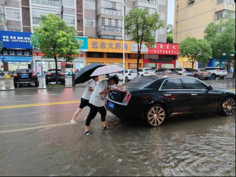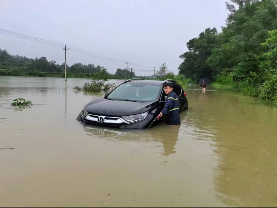6月29日,黃石陽新部分區域積水嚴重,黃石中支查勘員冒著大雨第一時間趕赴陽新木港鎮西垅村水淹地帶,查勘員不顧衣襪鞋褲浸濕,只身走進近1米的深水中,竭盡全力把拖車繩固定到標的車,用最短的時間完成施救,幫助車主脫困。