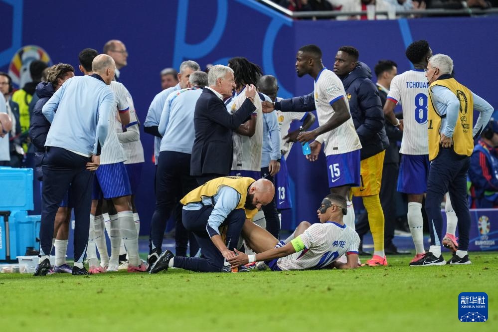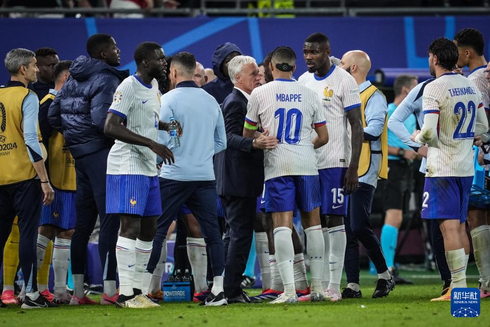 7月5日,法國隊主教練德尚(中)在加時賽下半場開始前與球員姆巴佩交談。新華社記者 潘昱龍 攝