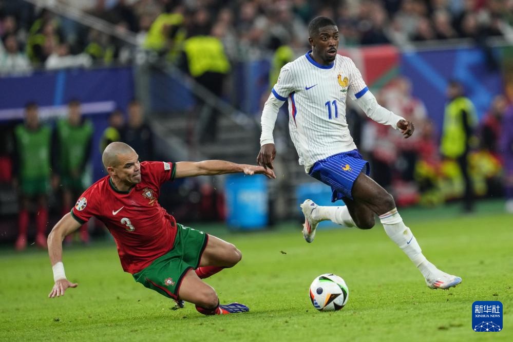 7月5日,法國隊球員登貝萊(右)帶球突破葡萄牙隊球員佩佩。新華社記者 潘昱龍 攝