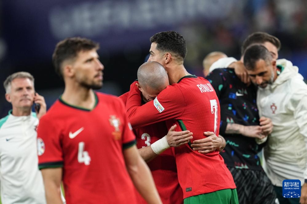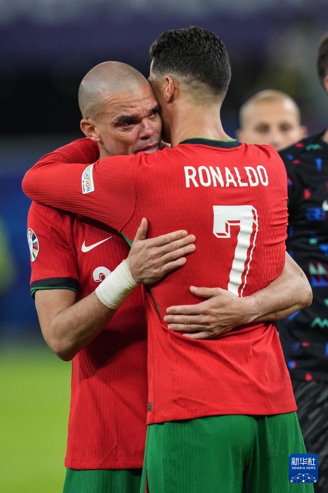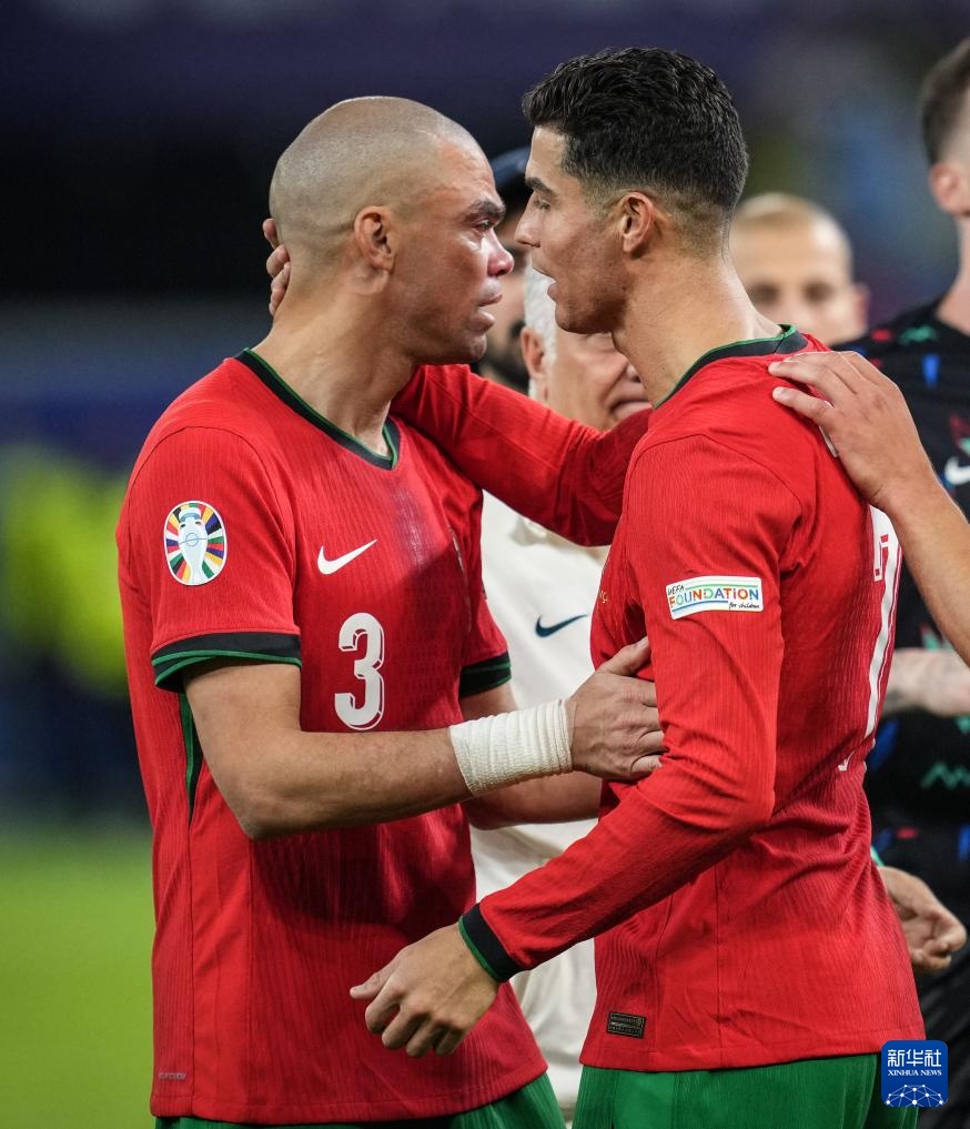 7月5日,葡萄牙隊球員克·羅納爾多(右)比賽后安慰隊友佩佩。新華社記者 潘昱龍 攝