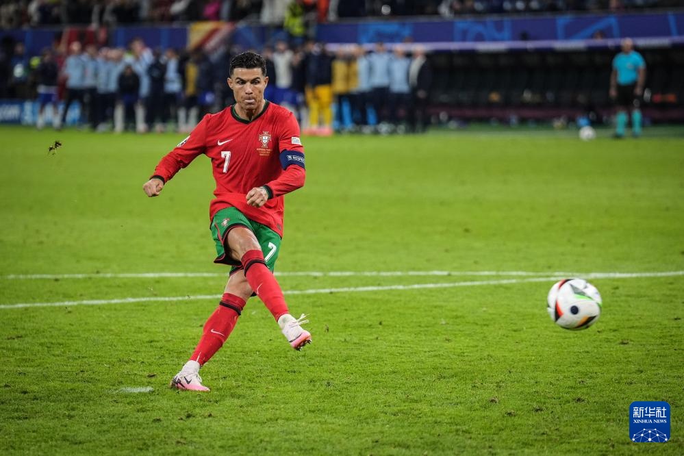 7月5日,葡萄牙隊球員克·羅納爾多在點球大戰中主罰點球命中。新華社記者 潘昱龍 攝