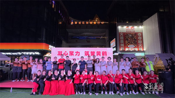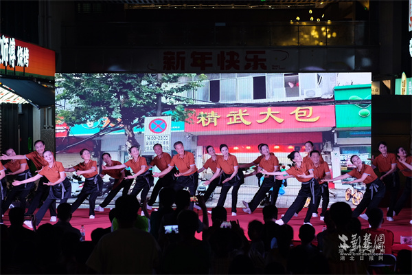 活動(dòng)現(xiàn)場,燈火璀璨、樂舞律動(dòng)、美食飄香……主舞臺(tái)上,由轄區(qū)居民、志愿者共演的公益宣傳短片《黃鶴樓下的溫暖》拉開活動(dòng)序幕。隨后,紫陽湖民族藝術(shù)團(tuán)帶來的開場表演《鼓舞秀》,鼓聲激昂、舞步熱烈,瞬間點(diǎn)燃現(xiàn)場氣氛。歌曲合唱《華夏》、兒童舞蹈《古麗古麗》等精彩表演輪番上演,燃起觀眾夏夜活力。武昌區(qū)文化館經(jīng)心藝術(shù)團(tuán)獻(xiàn)上終場表演《大成路過早》,以舞蹈形式生動(dòng)演繹出黃鶴樓街道大成路的溫暖煙火氣、特色文明風(fēng)。