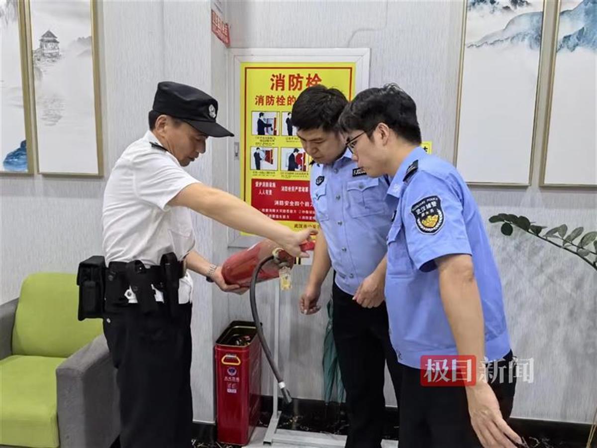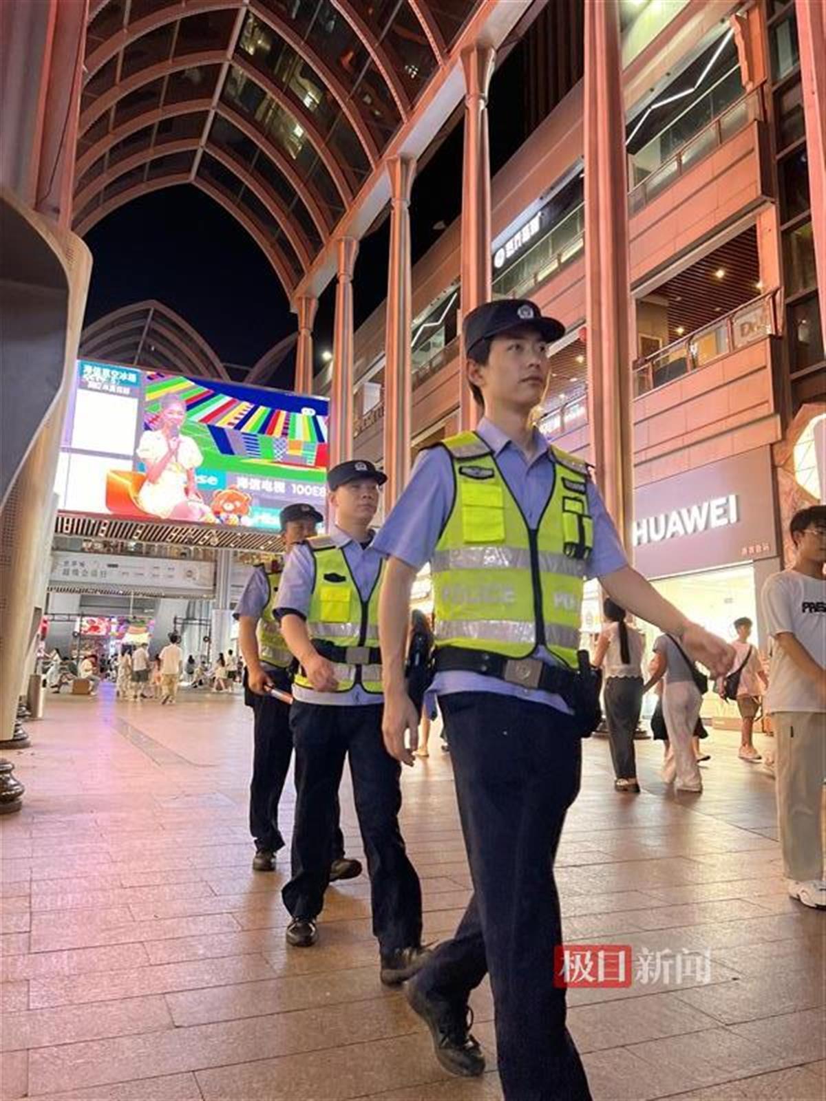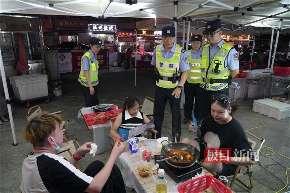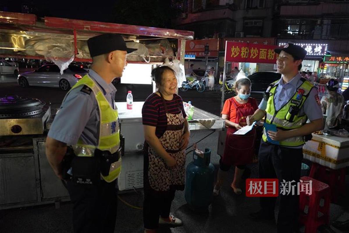 當晚,武昌區(qū)分局在全區(qū)重點部位、重點路段設置巡控點位92個,采用武裝巡邏、步巡、車巡、駐點等多種方式延伸“巡防線”,擴大“守護圈”。“滅火器一定要注意定期更換。”在眾誠廣場宵夜攤點,徐家棚派出所民警方卓、孫濤正在徒步巡邏并隨時檢查各類隱患,為美食一條街擰緊“安全閥”。