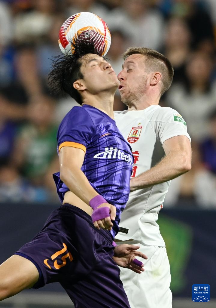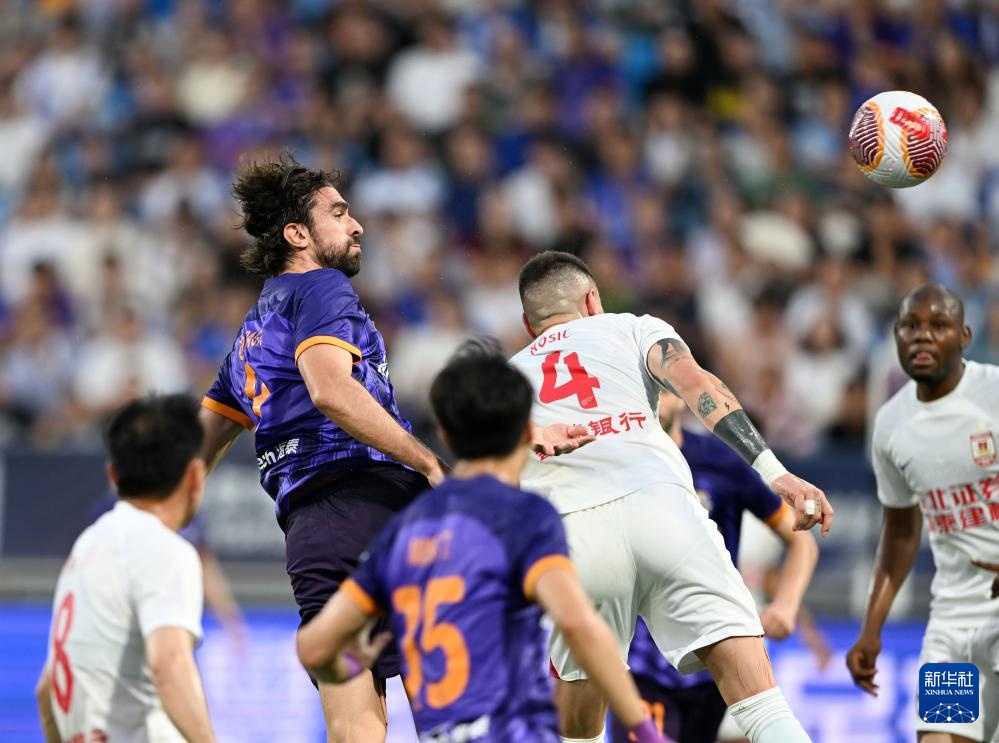 7月6日,天津津門虎隊孔帕尼奧(上左)在比賽中頭球破門。
