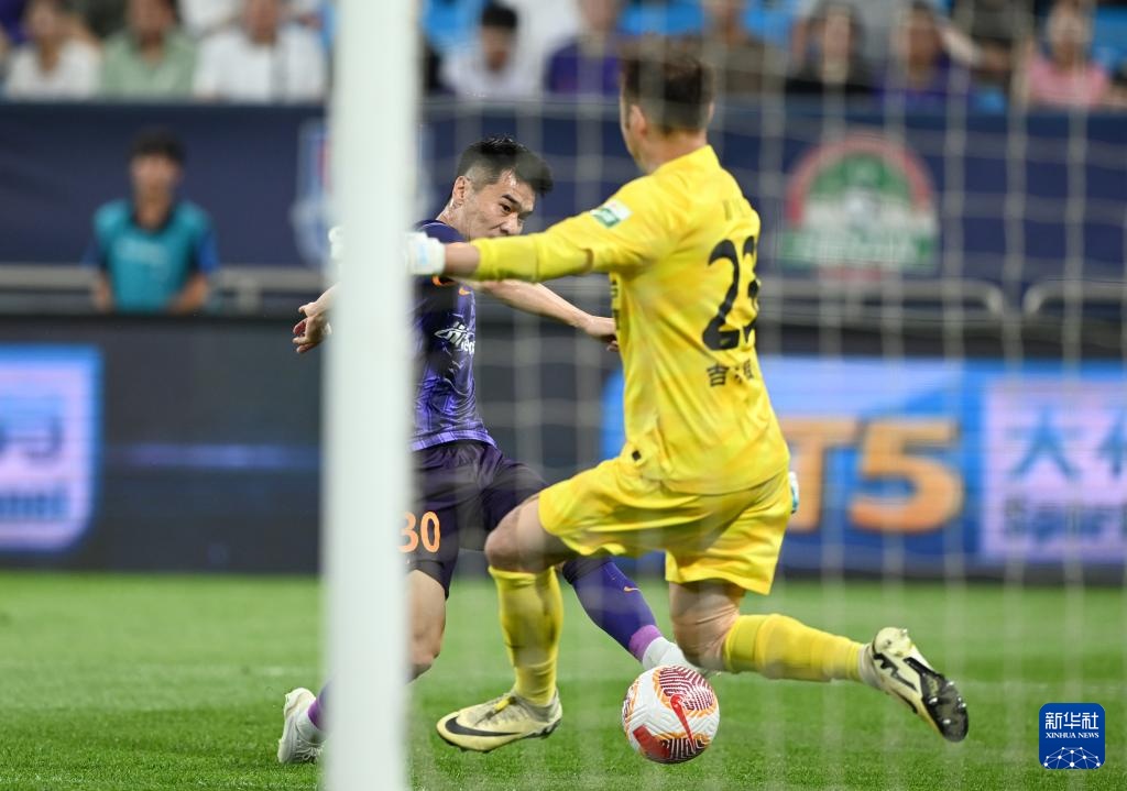 7月6日,天津津門虎隊球員王秋明(左)在比賽中射門得分。