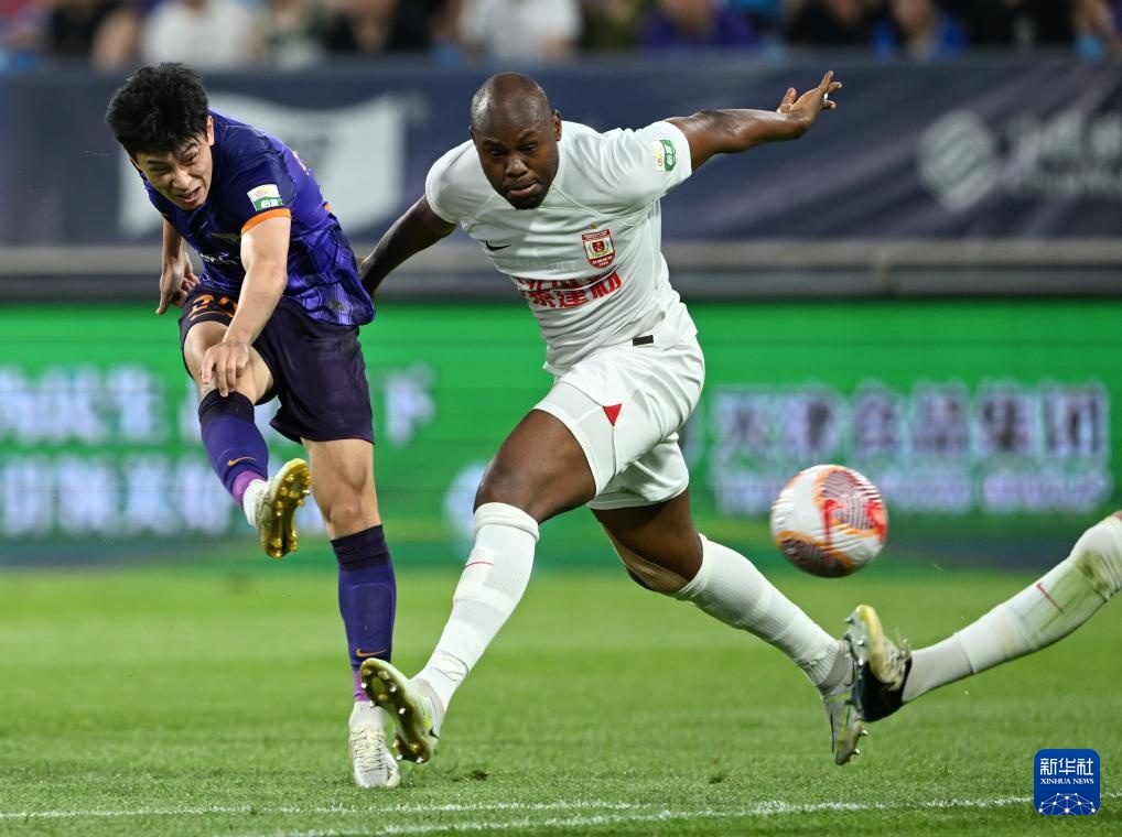 7月6日,天津津門虎隊球員巴頓(左)在比賽中射門。