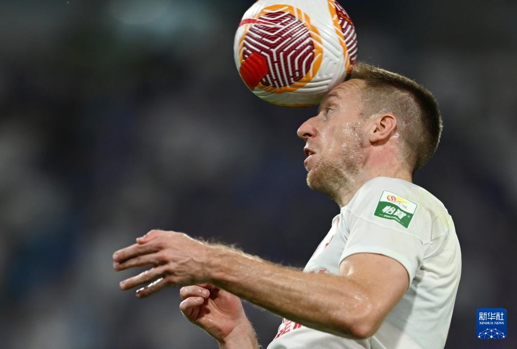 7月6日,長春亞泰隊球員貝里奇在比賽中頂球。
