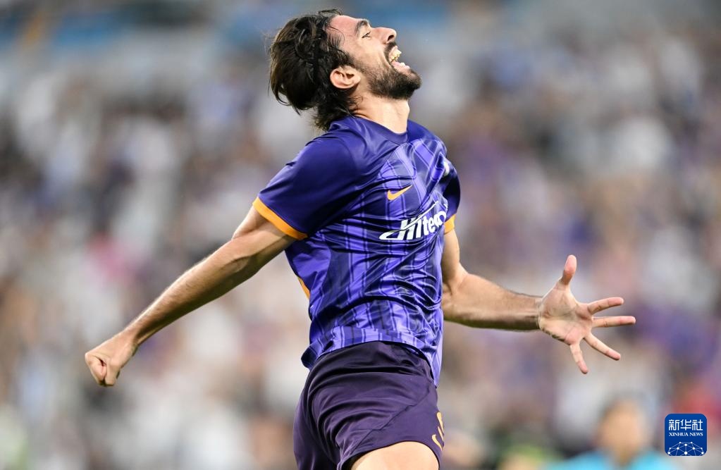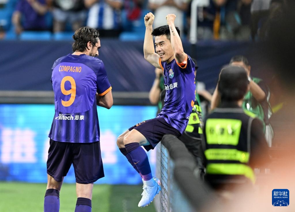 7月6日,天津津門虎隊球員孔帕尼奧在比賽中進球后慶祝。