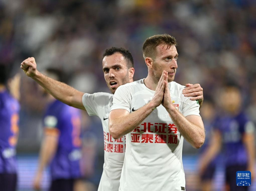 7月6日,長春亞泰隊球員貝里奇(右)在比賽中進球后。