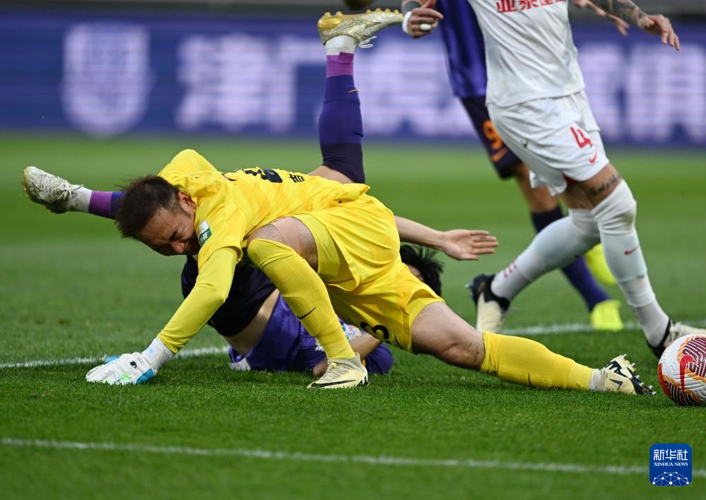 7月6日,長春亞泰隊守門員吳亞軻(前)在比賽中撲救時倒地。