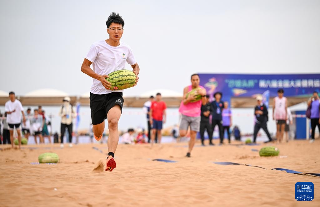 7月7日,參賽選手在搶種搶收硒砂瓜比賽中。新華社記者 馮開華 攝