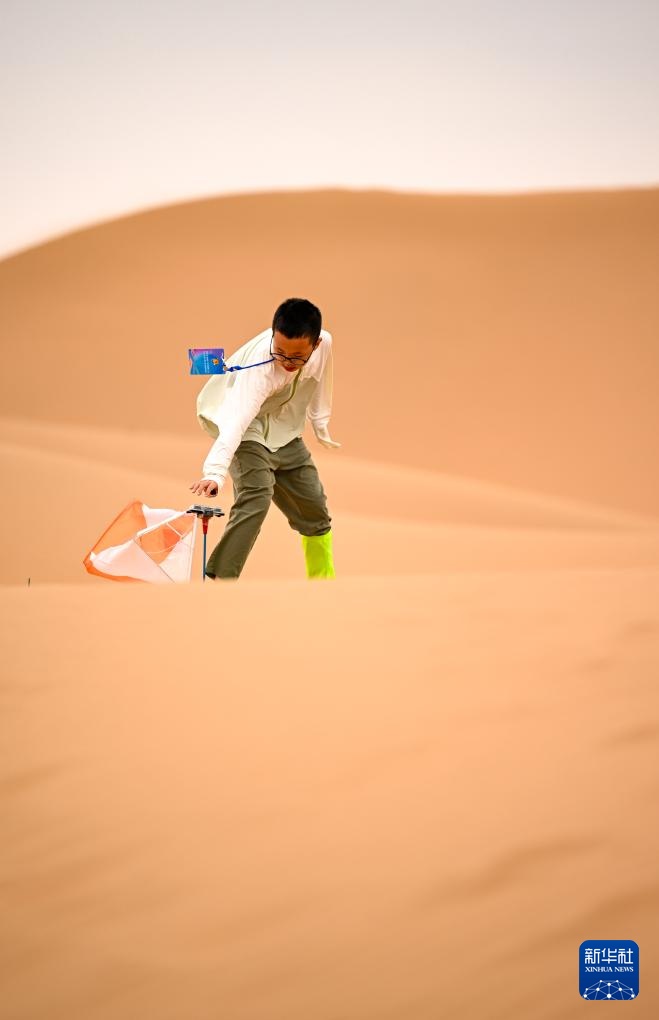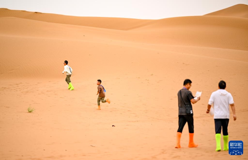 7月7日,參賽選手在沙漠親子定向尋寶比賽中打卡。新華社記者 馮開華 攝