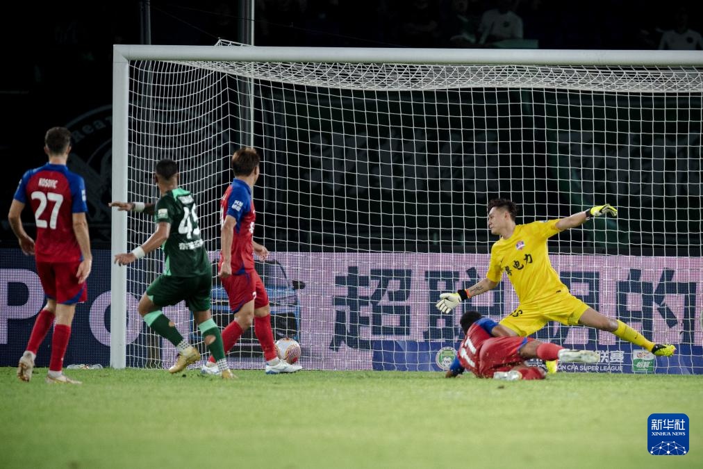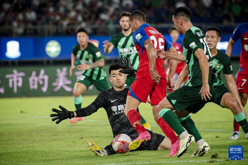 7月7日,浙江隊球員萊昂納多(左二)射門得分。新華社記者 江漢 攝