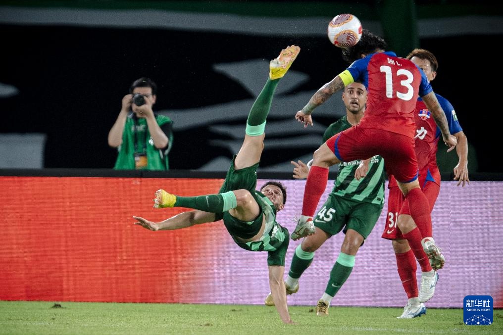 7月7日,浙江隊球員盧卡斯(左一)在比賽中倒鉤射門。新華社記者 江漢 攝