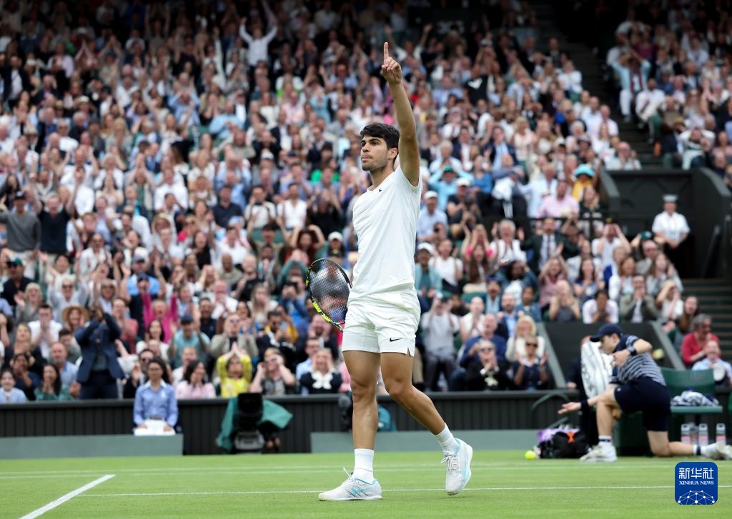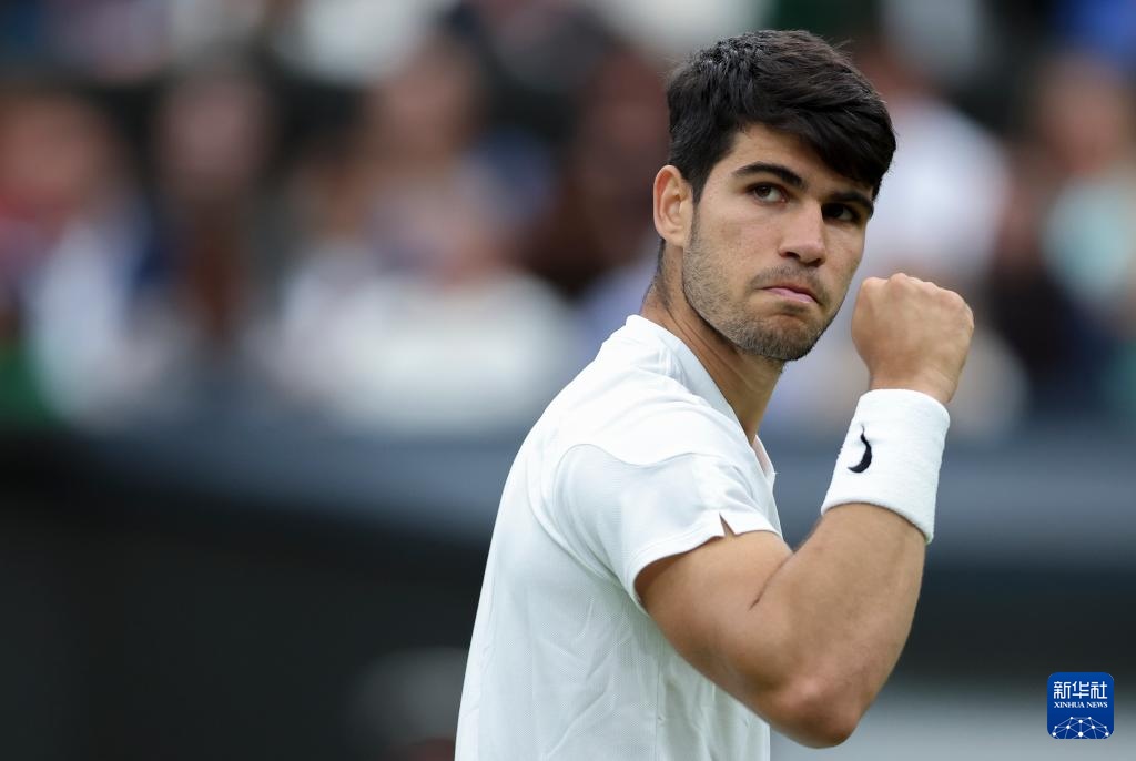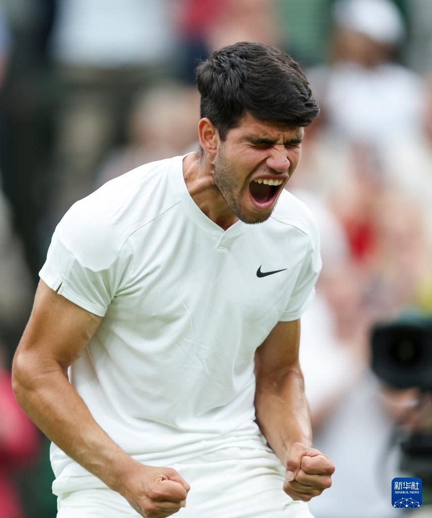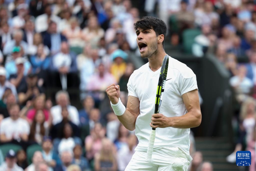 7月7日,阿爾卡拉斯在獲勝后慶祝。新華社記者 韓巖 攝