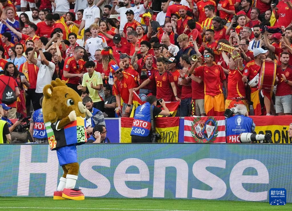 7月9日,歐錦賽吉祥物阿爾巴熊與西班牙隊球迷互動。新華社記者 張帆 攝