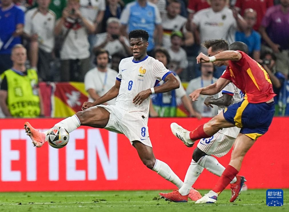 7月9日,法國隊球員坎特(中)與西班牙隊球員尼科·威廉姆斯在比賽中拼搶。新華社記者 張帆 攝