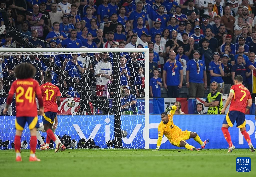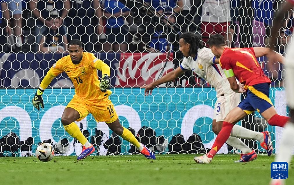 7月9日,法國隊守門員邁尼昂(右二)未能撲救出西班牙隊球員奧爾莫的射門。新華社記者 張帆 攝