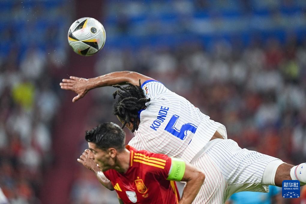 7月9日,法國隊球員孔德(右)與西班牙隊球員莫拉塔爭頂頭球。新華社記者 張帆 攝