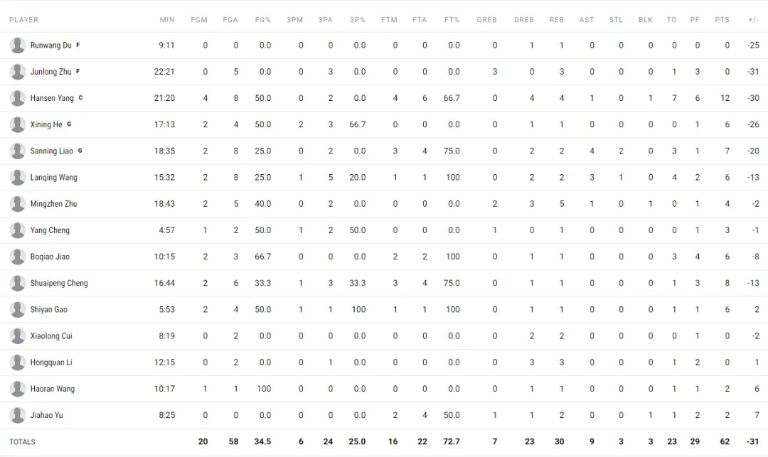 但隨著體能下降,球員們再次出現(xiàn)懼怕對抗、戰(zhàn)術跑位停滯、投籃命中率低等老問題。通過比賽表現(xiàn)分析,廖三寧、楊瀚森、王嵐嵚成為了球隊主要得分點,技術全面性有所體現(xiàn)。