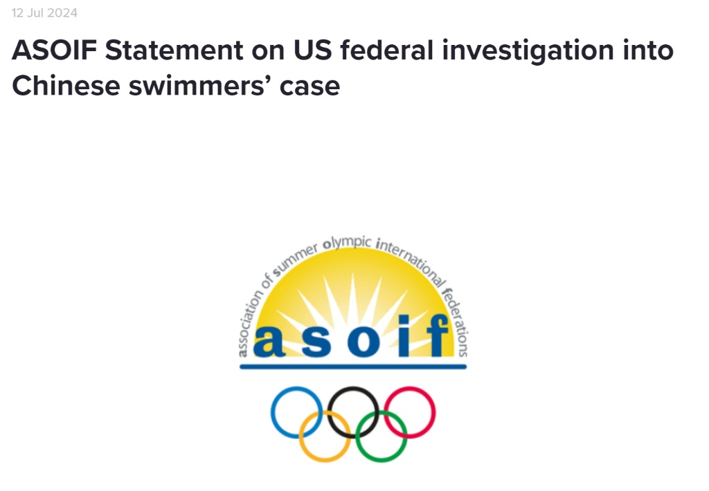 12日,夏奧協在聲明中表示,美國此次聯邦調查和就涉及中國游泳運動員的反興奮劑事件向世界泳聯執行主任發出傳票,有可能破壞WADA和普遍適用的《世界反興奮劑條例》的基本原則。