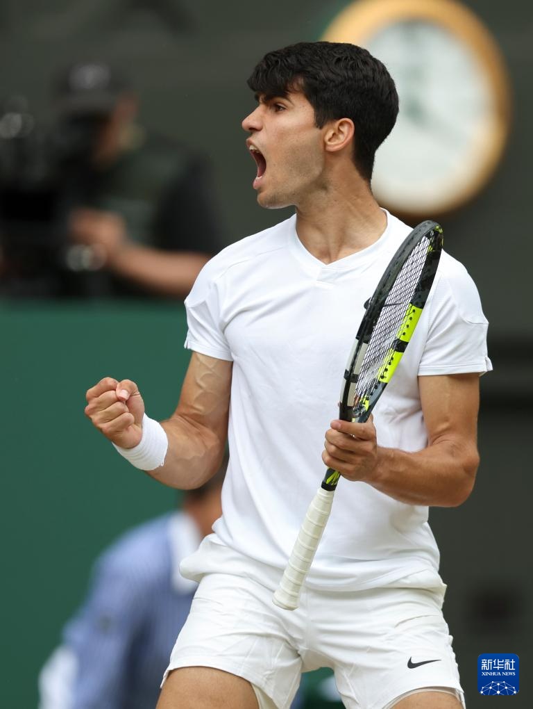 7月12日,阿爾卡拉斯在比賽中慶祝得分。新華社記者 韓巖 攝