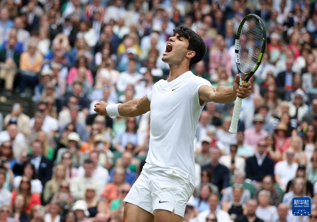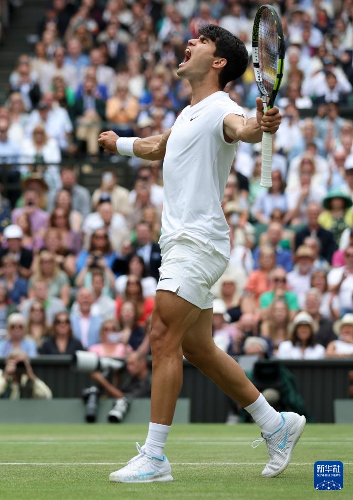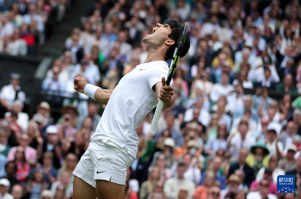 7月12日,阿爾卡拉斯在獲勝后振臂慶祝。新華社記者 韓巖 攝