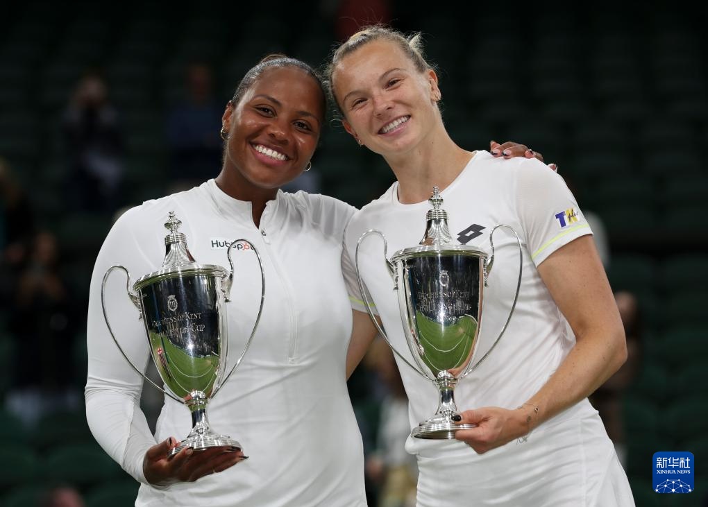 7月13日,西尼亞科娃/湯森德(左)在頒獎儀式上手捧獎杯慶祝。新華社記者 韓巖 攝