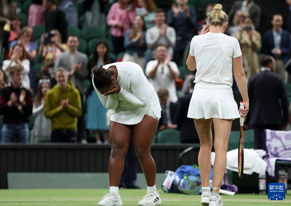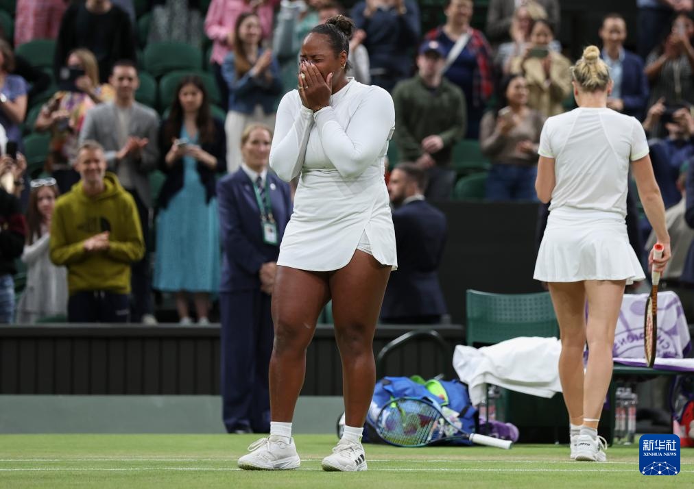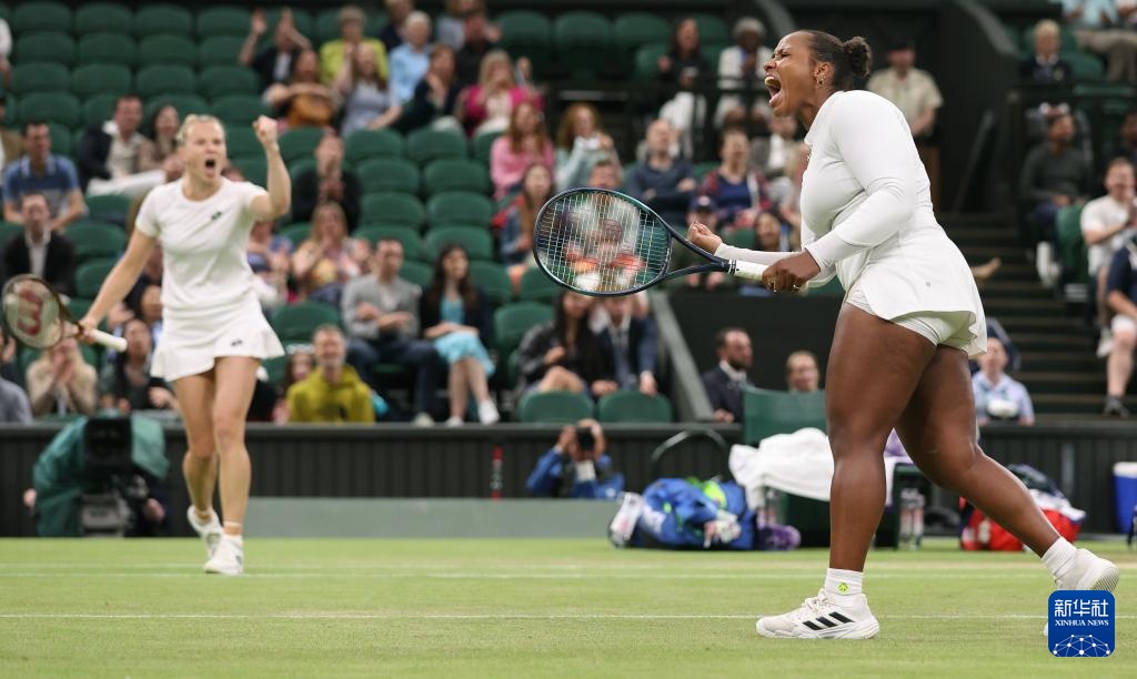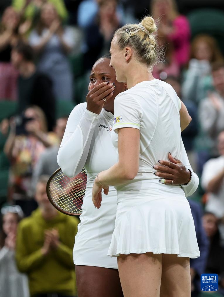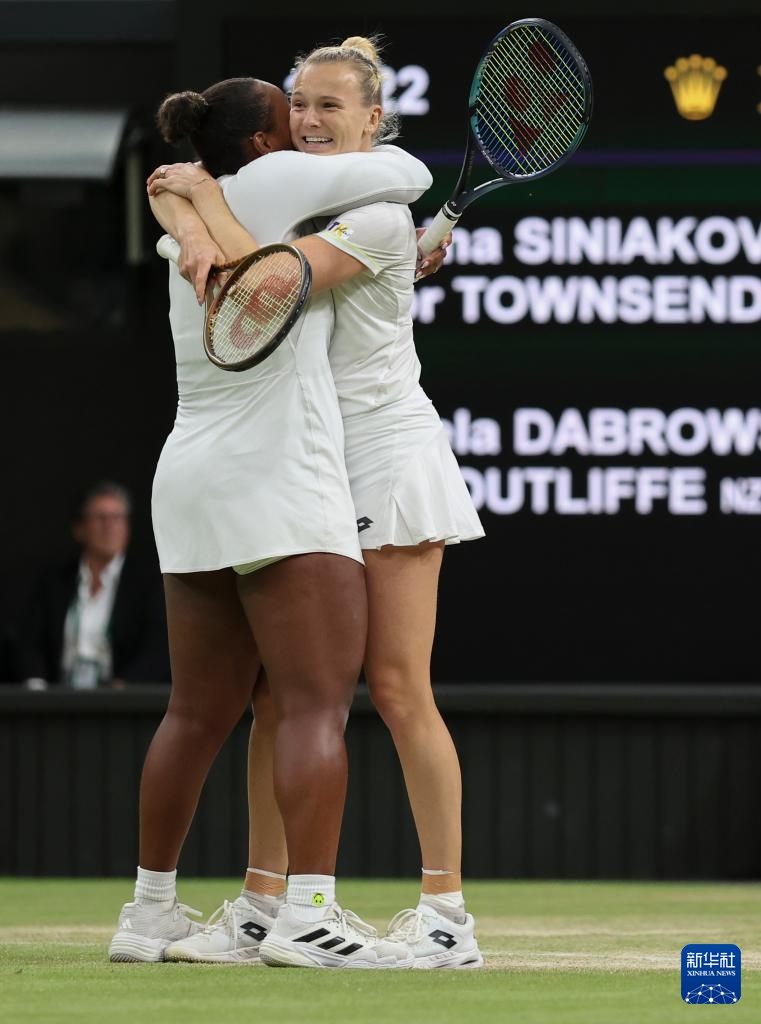 7月13日,西尼亞科娃(右)/湯森德在獲勝后慶祝。新華社記者 韓巖 攝