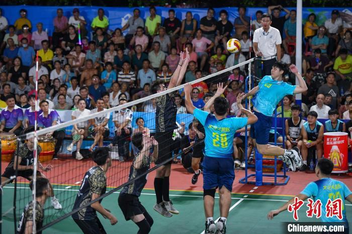 7月13日晚,2024年“九九杯”海南(文昌)鄉鎮排球聯賽鋪前站迎來一場中馬排球友誼賽。圖為比賽現場熱鬧場景。中新網記者 駱云飛 攝
