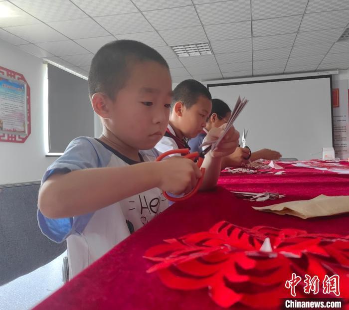 蘇一航(左一)正在剪紙。 石洪宇 攝