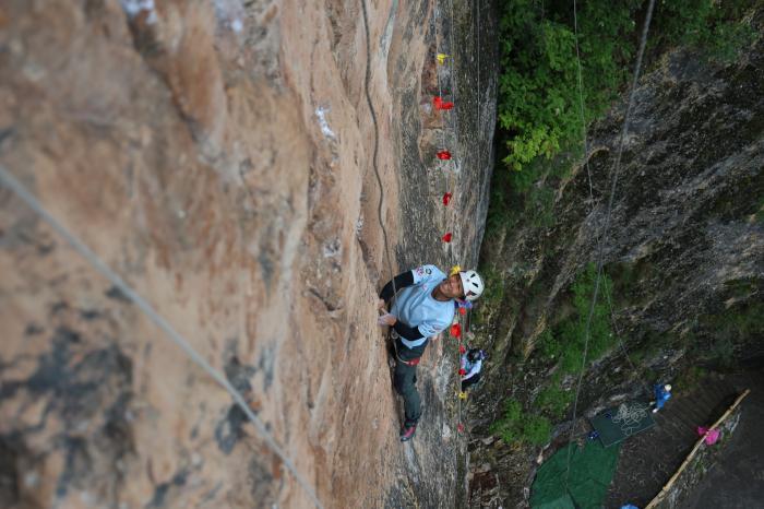 據悉,中國攀巖自然巖壁系列賽始于2017年,是國內唯一以“自然巖壁攀巖”為主題的國家級攀巖賽事。本屆大賽揭幕戰的賽場位于遮陽山景區的千仞雄峰巖壁。決賽當天,巖壁共設置了3條難度級別達到5.12,長度50米的路線,時間限制從預賽的8分鐘縮短為6分鐘。這種線路設置對運動員的肢體力量、柔韌性、路線解讀能力都有極大考驗。